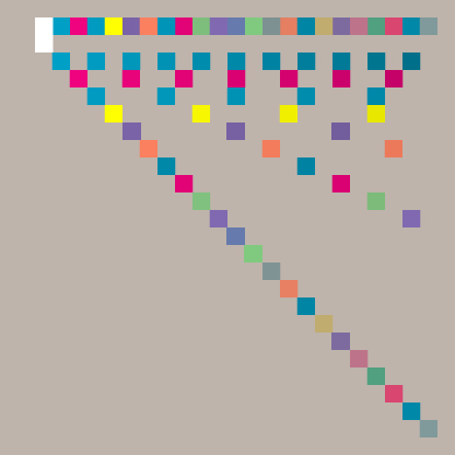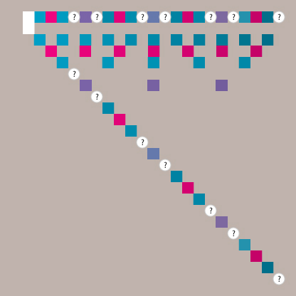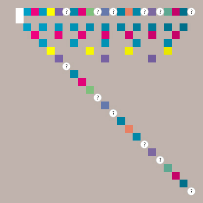 | The first line will be the result of a mix of the different colours from the columns. The first column is in white. The second line should be from white to an infinite grey. There is no shingle in the upper left corner: no support, no colour. On the third line, one pebble on two will be painted in cyan, darker and darker. On the fourth line, one shingle on three will be painted in magenta colour, darker and darker. For the fifth line we don’t need a new colour because it is done yet in the corresponding column (Fig. 4a). We notice that on the first line, we already have roughly two third of the pebbles painted in different colours but with the forth columns we need to create a new colour: yellow for example, which the third primary colour. (Fig4b). Fig 4c has one more new colour, orange, and Fig 4d complete this small portion of the grid. As we see, this dynamic construction can go infinitely. Each time we encounter an empty column we need a new colour. And it is always a new start. The coloration of the third line covers half of the resultant line. The coloration of the forth line covers a third more (some have double colours) etc. Of course, it would have been simpler to colour the pebbles in grey or cyan, darker and darker or brighter and brighter; but what about colours? And would it be beautiful? It is an “at will choice”… | La première ligne sera le résultat du mélange des couleurs de chaque colonne. La première colonne est en blanc. La seconde ligne est un blanc dégradé gris à l’infini. Il n’y a pas de galet en haut à gauche : pas support, pas de couleur. Sur la troisième ligne on colore un galet sur deux en cyan allant en dégradé foncé à l ‘infini. Pour la quatrième ligne un galet sur trois sera peint en magenta dégradé foncé à l’infini. La couleur de la cinquième ligne est déjà donnée par le premier dégradé de cyan de la seconde ligne. (Fig. 4a). Notons que les galets du début de la première ligne sont déjà grossièrement colorés au tiers mais nous devons trouver une nouvelle couleur pour la quatrième colonne : le jaune par exemple qui est la troisième couleur primaire. (Fig. 4b) Fig. 4c montre l’orange comme nouvelle couleur et la (Fig. 4d) montre que tous les galets de la première ligne sont peints différemment. Cette construction dynamique se poursuit indéfiniment. Chaque fois qu’un galet n’est pas déjà peint on a besoin d’une nouvelle colonne. C’est un nouveau départ. La coloration de la troisième ligne couvre la moitié de la première et celle de la quatrième le tiers. Un galet peint sur deux a deux couleurs. Etc. Bien sur il eut été plus simple de colorer les galets en dégradé de gris ou cyan ; mais où seraient les couleurs ? Et l’esthétique ? Alors, c’est un choix arbitraire ! | |||||||||||||||||||||||||||||||