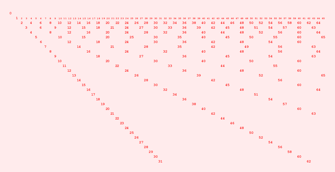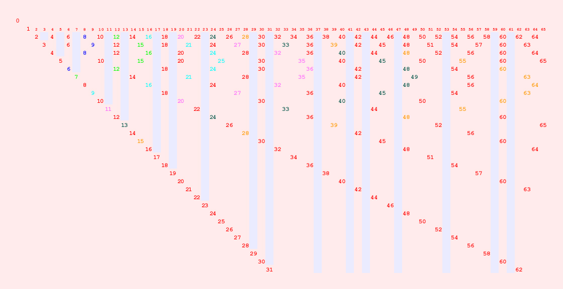 | Here is a new view of the sieve. Each line is an unlimited addition of the same number and could be considered as a simple list of all multiples. We quickly notice that some columns are empty. There all are marked by a prime number. The second fact is those nice aesthetic curves with a shape of a comet. They are those horizontal lines from the first view of the sieve. The third thing to observe is this sort of pyramidal shape around 60 and, “cherry of the Sunday”, two primes numbers on each side! But be carful, it will not be a rule, may be a statistic rule, only. This not the way primes works. So with the next figure just enjoy the view and make your own deductions. | Chaque ligne est donc une addition sans limite d’un même nombre et peut être considérée comme tous les multiples de ce nombre. On note rapidement que des colonnes sont vides. Elles correspondent toutes à un nombre premier. La seconde chose à noter est ces courbes esthétiques en forme de comète. Elles correspondent aux lignes horizontales du premier tableau. La troisième chose est cette forme de pyramide autour du nombre 60. Et, « cerise sur le gâteau », le 60 entouré de deux nombres premiers ! Mais attention, ce n’est pas une future règle, tout juste peut-être une loi statistique. Les nombres premiers ne fonctionnent pas ainsi. Aussi, profitez de la vue du tableau suivant pour faire quelques déductions personnelles. | |||||||||||||||||||||||||||||||