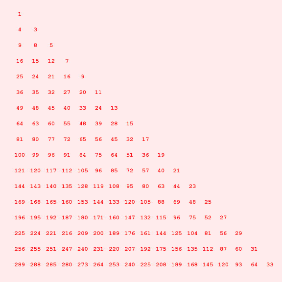 | The way to built the sieve is: It results a series of regulars’ obliques composed by addition of the same number. The first column is composed of the succession of squares. All odds, which are not in the triangle but are only in the right oblique, are Prime Numbers. The most interesting thing is the way horizontal lines are designed. Suites are so formed: n2 , (n2 -1), (n2 - 22), (n2 - 32), (n2 - 42), … , (2n -1). Those suites are seen in colours in figure 3. They form the sieve. In theory, it is possible to start the construction of the sieve from any number and find the succession of all prime numbers between any numbers. It is very elegant to consider it between two consecutive squares. It will show that the amount of Prime Numbers extends regularly between consecutives squares according an increasing range. It will show that the increasing number and its rhythm follow the Gauss’ formula which give the aproximate numbers of Prime Numbers up to a choosen number. For a better understanding, here is another point of view: The idea is to dispatch integers on different lines with an equal interval between numbers. On the first line are all numbers, on the second we select one every two, the next will be every three, every for, etc. It gives you the following picture: | On construit le crible ainsi: L’oblique extérieure est formée par la succession des nombres impairs Vous ajoutez 3 à 1, qui donne 4 Vous ajoutez 5 à 3, qui donne 8 Vous ajoutez 5 à 4, qui donne 9 Etc. Il résulte une série d’obliques régulières composes par l’addition d’un même nombre. La première colonne est composée de la succession des carrés. Tous les nombres qui ne sont pas dans le triangle, mais sont seulement dans l’oblique sont des nombres premiers. La chose la plus intéressante du crible est la forme des suites horizontales qui en résulte: n2 , n2 -1 , n2 - 22 , n2 - 32 , n2 - 42 , … , (2n -1). En théorie, ces suites permettent de démarrer la construction du crible à partir de n’importe quel nombre et de trouver la succession de tous les nombres premiers entre n’importe quels nombres ; le plus élégant étant de rechercher entre deux carrés consécutifs. Cela permettra de constater que la quantité de nombres premiers entre ces carrés augment régulièrement selon une fourchette aussi croissante. On pourra vérifier que nombre et croissance correspondent à la formule de Gauss qui donne approximativement la quantité de nombres premiers jusqu'à un nombre choisi. Pour une meilleure compréhension voici un autre point de vue: L’idée est de répartir les nombres entiers sur des lignes différentes selon leur écart. Sur la première on les inscrit tous. Sur la seconde on en inscrit un sur deux puis sur la troisième une sur trois, etc. On obtient le tableau suivant: | |||||||||||||||||||||||||||||||
