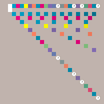 | The first line will be the result of a mix of the different colours from the columns. The first column is in white. The second line should be from white to an infinite grey. There is no shingle in the upper left corner: no support, no colour. On the third line, one pebble on two will be painted in cyan, darker and darker. On the fourth line, one shingle on three will be painted in magenta colour, darker and darker. For the fifth line we don’t need a new colour because it is done yet in the corresponding column (Fig. 4a). We notice that on the first line, we already have roughly two third of the pebbles painted in different colours but with the forth columns we need to create a new colour: yellow for example, which the third primary colour. (Fig4b). Fig 4c has one more new colour, orange, and Fig 4d complete this small portion of the grid. As we see, this dynamic construction can go infinitely. Each time we encounter an empty column we need a new colour. And it is always a new start. The coloration of the third line covers half of the resultant line. The coloration of the forth line covers a third more (some have double colours) etc. Of course, it would have been simpler to colour the pebbles in grey or cyan, darker and darker or brighter and brighter; but what about colours? And would it be beautiful? It is an “at will choice”… | La première ligne sera le résultat du mélange des couleurs de chaque colonne. La première colonne est en blanc. La seconde ligne est un blanc dégradé gris à l’infini. Il n’y a pas de galet en haut à gauche : pas support, pas de couleur. Sur la troisième ligne on colore un galet sur deux en cyan allant en dégradé foncé à l ‘infini. Pour la quatrième ligne un galet sur trois sera peint en magenta dégradé foncé à l’infini. La couleur de la cinquième ligne est déjà donnée par le premier dégradé de cyan de la seconde ligne. (Fig. 4a). Notons que les galets du début de la première ligne sont déjà grossièrement colorés au tiers mais nous devons trouver une nouvelle couleur pour la quatrième colonne : le jaune par exemple qui est la troisième couleur primaire. (Fig. 4b) Fig. 4c montre l’orange comme nouvelle couleur et la (Fig. 4d) montre que tous les galets de la première ligne sont peints différemment. Cette construction dynamique se poursuit indéfiniment. Chaque fois qu’un galet n’est pas déjà peint on a besoin d’une nouvelle colonne. C’est un nouveau départ. La coloration de la troisième ligne couvre la moitié de la première et celle de la quatrième le tiers. Un galet peint sur deux a deux couleurs. Etc. Bien sur il eut été plus simple de colorer les galets en dégradé de gris ou cyan ; mais où seraient les couleurs ? Et l’esthétique ? Alors, c’est un choix arbitraire ! | |||||||||||||||||||||||||||||||